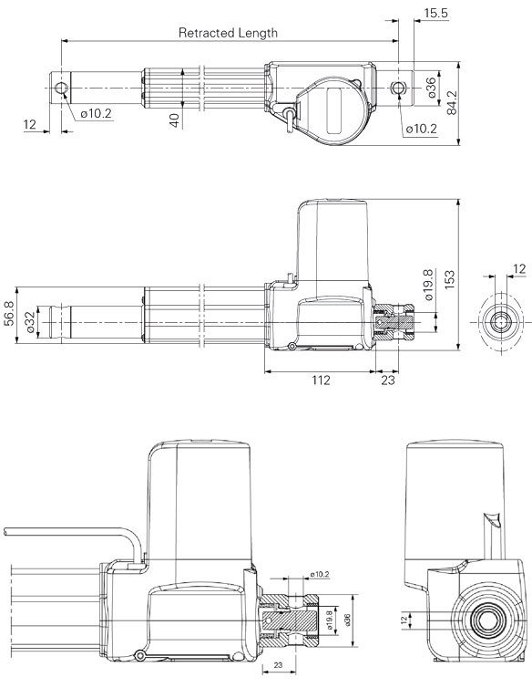 Care-motion Voltage of motor : 12V DC, 24V DC or 36V DC Maximum load : 6,000N in push Maximum load : 4,000N in pull Maximum speed : 14.3mm/s Minimum installation dimension : Stroke +188mm Color : black or grey Protection class : IP42, IP54, or IP66