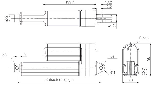 Care-motion Voltage of motor : 12V DC or 24V DC Maximum load : 2,500N Maximum speed : 18.9mm/s Minimum installation dimension : Stroke +112mm Color : black or grey Protection class : IP42, IP54 or IP66